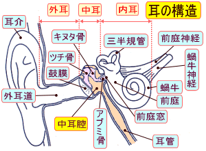 耳の鼓膜から奥の構造で中耳腔、耳小骨、耳管からなる